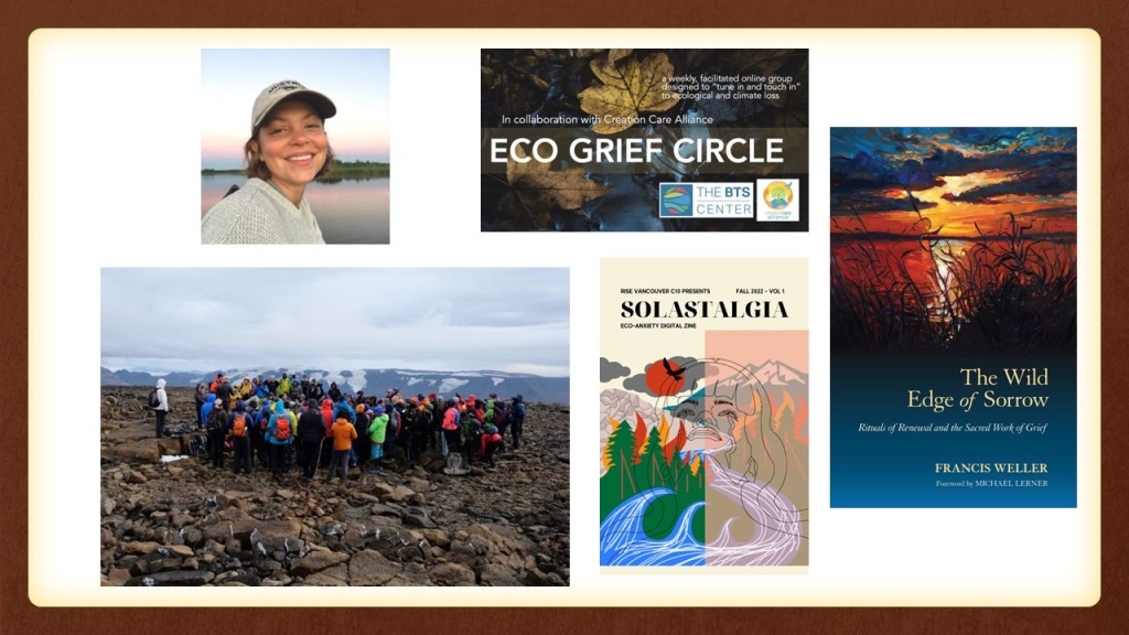 We began today with a land acknowledgement. And every land acknowledgement brushes up against a deep well of historical trauma and grief. To speak of ecological grief as an emerging phenomenon is absurd without first acknowledging that it is a present reality for so many. As Indigenous scholar Kyle Whyte writes, “In the Anthropocene, then, some indigenous peoples already inhabit what our ancestors would have likely characterized as a dystopian future.” As a philosopher, Whyte has theorized an Indigenous ethic of sustainability and spiritually appropriate science. He also amplifies the many examples of Indigenous communities that are restoring ecological and cultural connections to place and species despite the heavy losses wrought by colonial violence and erasure.
